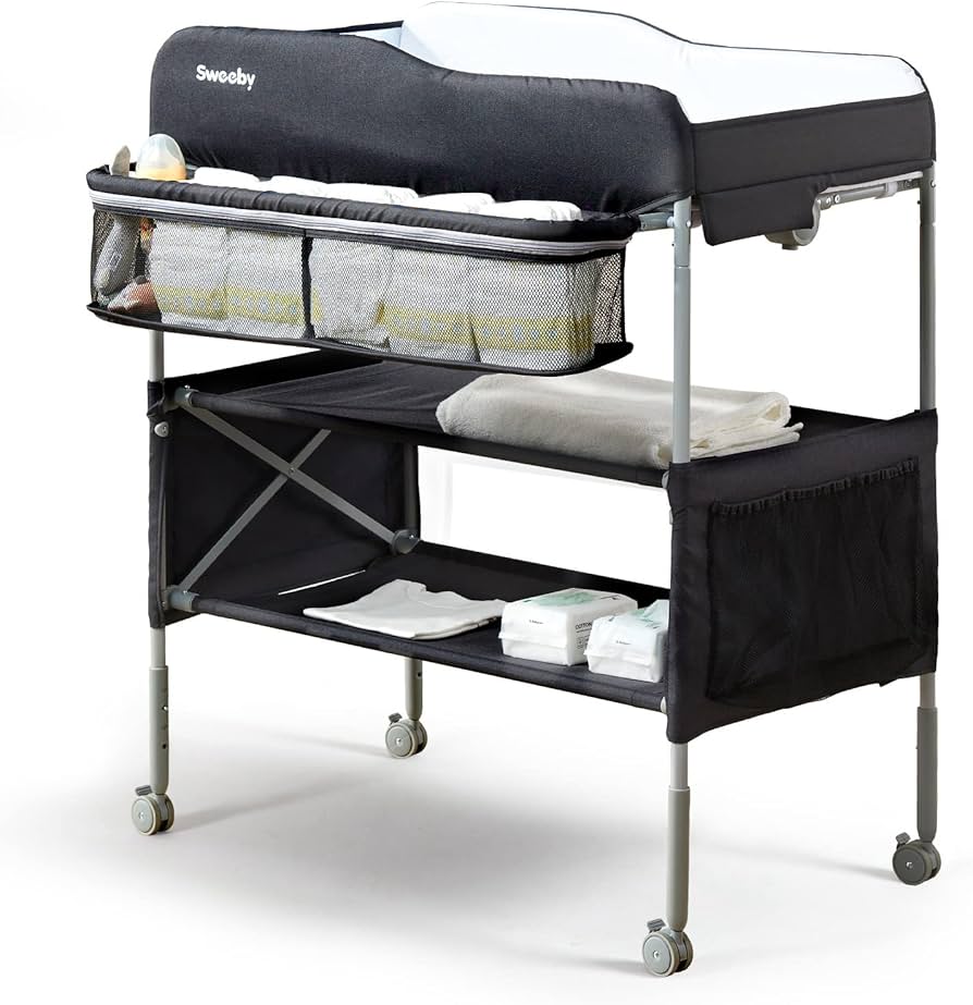Su diseño plegable facilita el guardado cuando no está en uso, y la bandeja inferior permite tener pañales, toallitas y accesorios siempre a mano.