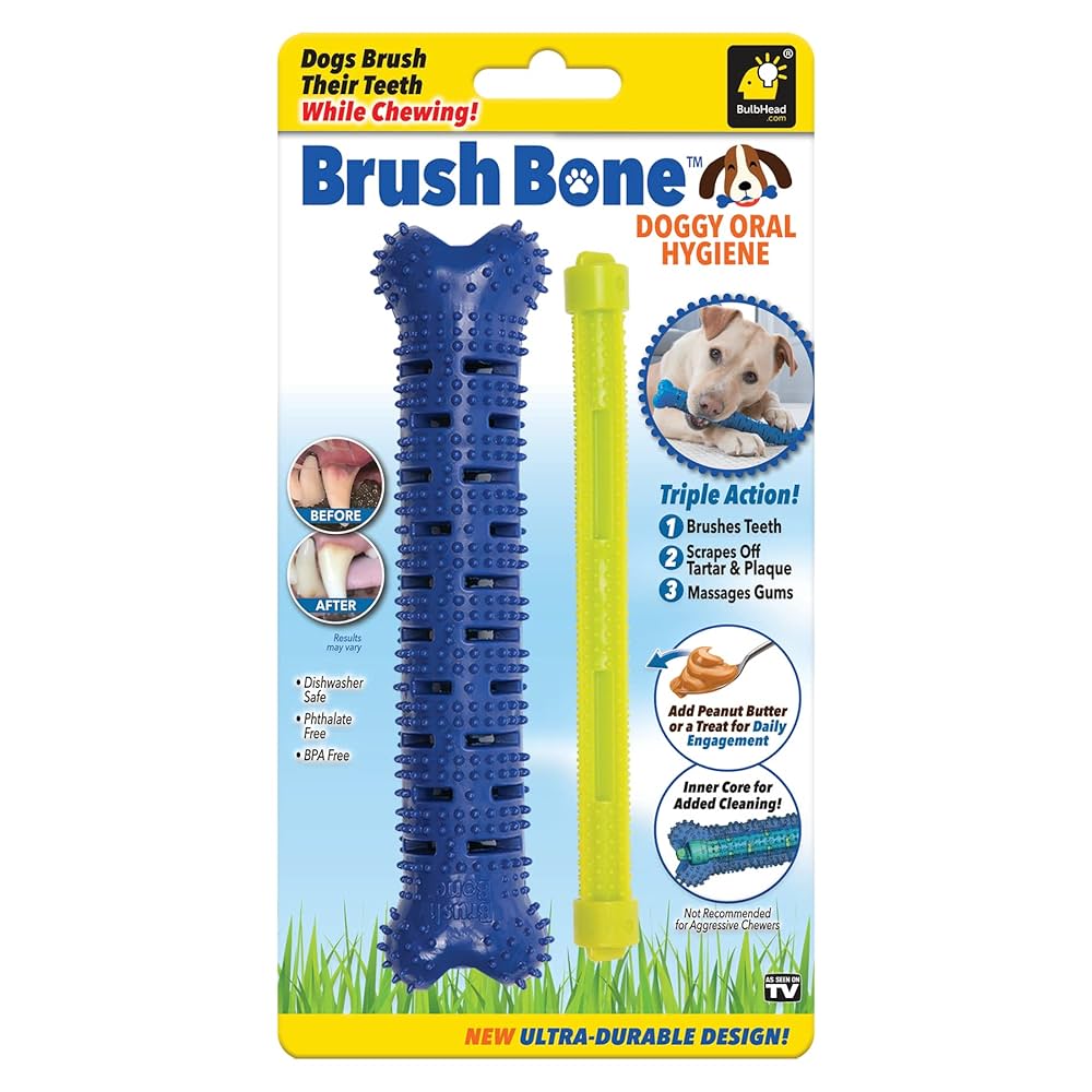Descripción del producto: El Chew Brush es un juguete masticable para perros que funciona como cepillo dental. Fabricado en goma flexible y resistente, cuenta con cerdas internas y ranuras dentales que limpian los dientes mientras el perro juega. Ayuda a reducir placa, sarro y mal aliento, masajea las encías y mejora la salud bucal sin necesidad de cepillado manual. Ideal para razas medianas y grandes.