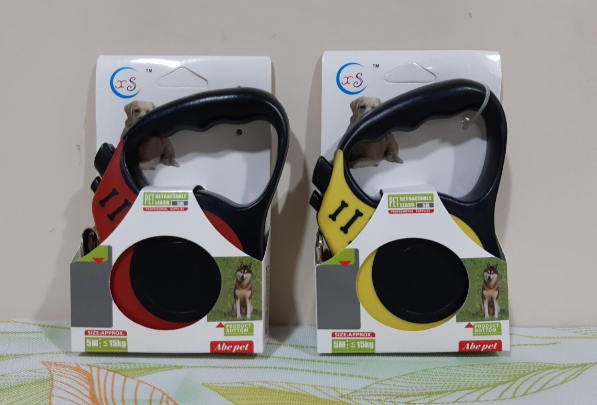 Estas son correas retráctiles para mascotas Abe pet, disponibles en colores rojo y amarillo.