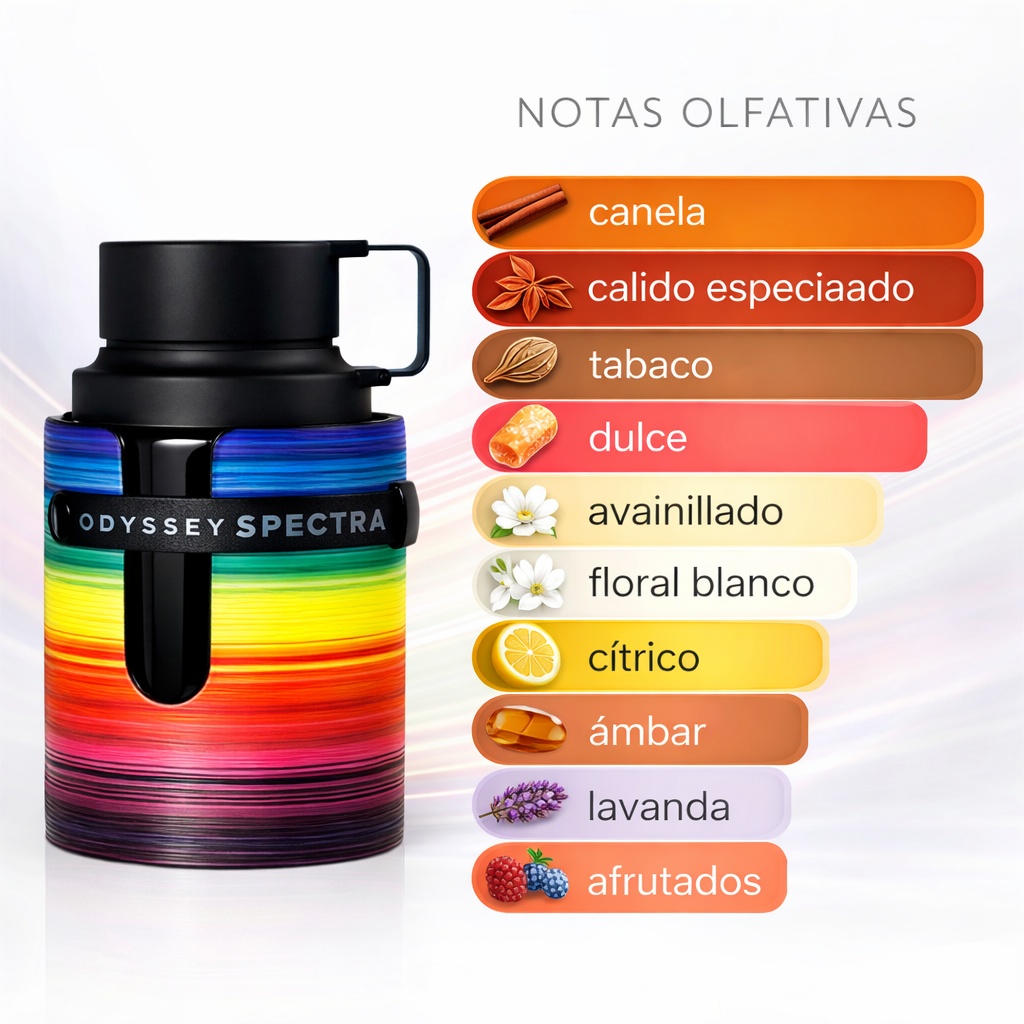 Odyssey Spectra 100 ml EDP es una fragancia masculina moderna, sofisticada y con personalidad propia, diseñada para el hombre que quiere destacar con un aroma distintivo y elegante. Pertenece a la prestigiosa línea Odyssey de Armaf, reconocida por su calidad, carácter y buen desempeño en estela y duración.