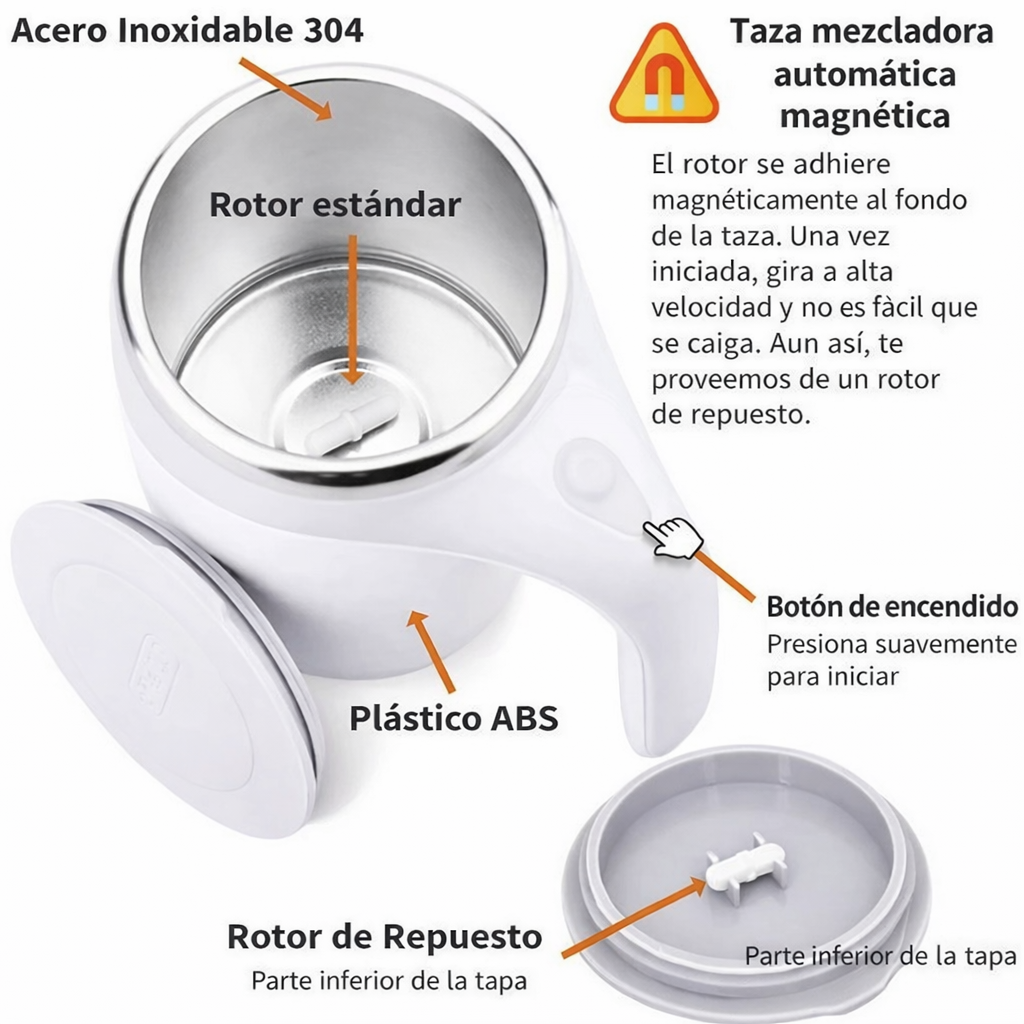 Incorpora un rotor magnético ubicado en la base de la taza que gira a alta velocidad para mezclar de forma eficiente café, chocolate, leche o suplementos en polvo.