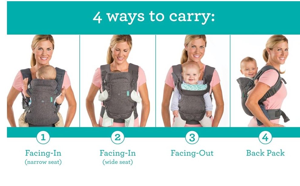 4 formas de llevar: mirando hacia adentro (asiento estrecho), mirando hacia adentro (asiento ancho), mirando hacia afuera y mochila